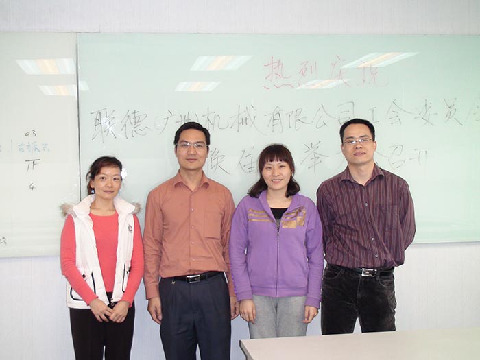 2010年4月23日, 在聯(lián)德(廣州)機械有限公司會議室內(nèi),聯(lián)德工會委員會召開了工會換屆選舉大會。本次選舉大會采用民主投票制度,由聯(lián)德(廣州)機械有限公司全體工會成員自 主投票,選舉產(chǎn)生新一屆工會主席以及工會委員。最后選舉結(jié)果是由鄭小波擔(dān)任新一屆工會主席,工會委員分別是張月蘭、古振興、黎英。
