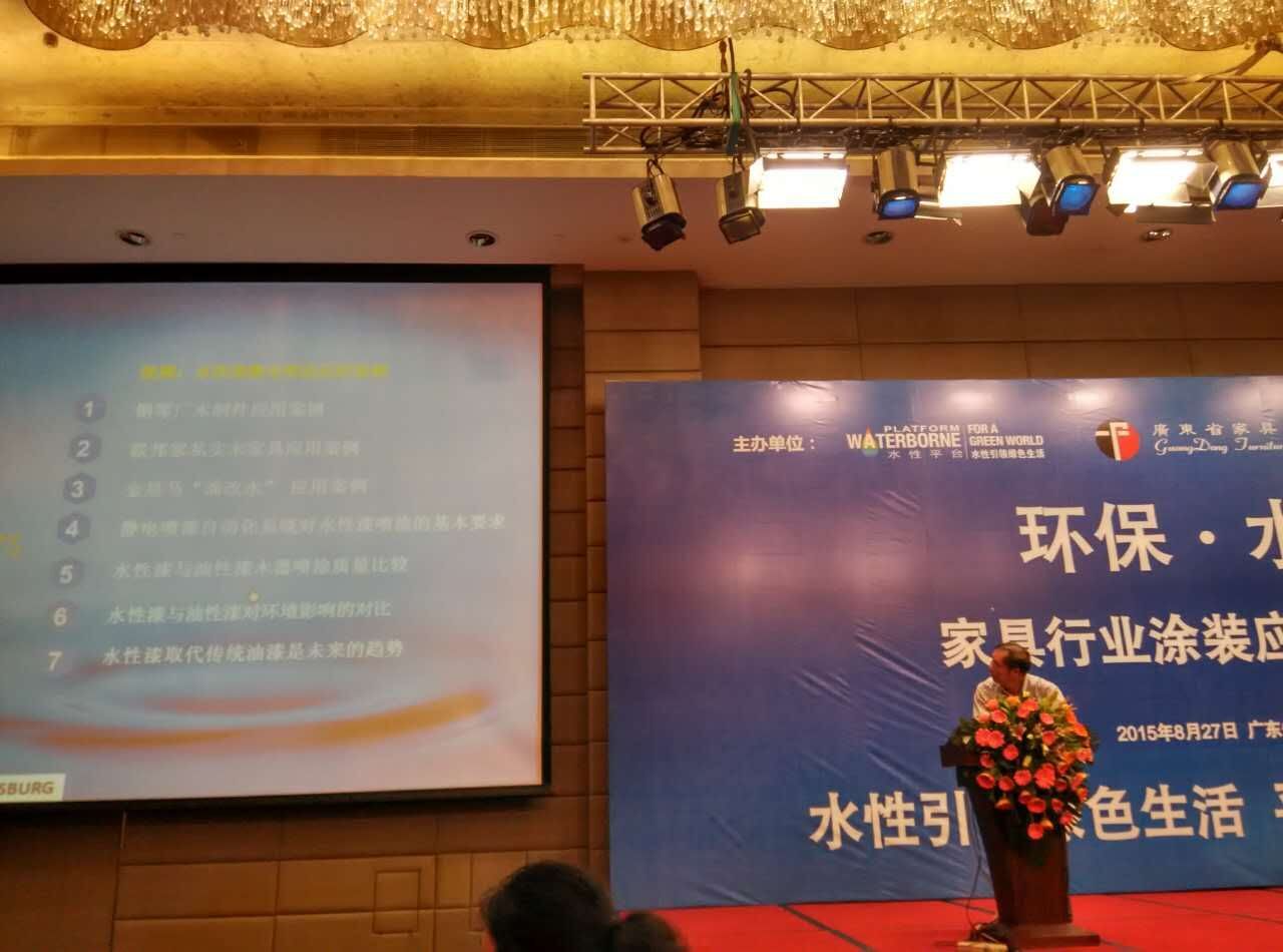 2015年8月27日,為積極推進(jìn)水性涂裝在家具行業(yè)的應(yīng)用,由中國化工學(xué)會涂料涂裝專業(yè)委員會水性涂料分會(簡稱“水性平臺”)、廣東省家具協(xié)會、和廣東省涂料行業(yè)協(xié)會一起主辦的“環(huán)保·水性,家具行業(yè)涂裝應(yīng)用推廣會”在順德金茂華美達(dá)酒店順利召開。會議圍繞廣東省地方環(huán)保政策、廣東省家具和涂料市場的發(fā)展?fàn)顩r、水性涂料和涂裝的技術(shù)應(yīng)用等方面展開,以家具產(chǎn)業(yè)上下游聯(lián)動的形式做了交流。共計250位嘉賓參加了會議,包括上游涂料供應(yīng)商、設(shè)備供應(yīng)商和下游家具制造企業(yè)、行業(yè)媒體等。參會的領(lǐng)導(dǎo)包括:廣東省環(huán)保廳大氣監(jiān)測與科技標(biāo)準(zhǔn)處王大力副處長;水性平臺理事長裴忠華;廣東省家具協(xié)會會長王克、秘書長張承志;廣東省涂料行業(yè)協(xié)會會長黃開、秘書長呂水列、主任黃永漢;佛山市家具行業(yè)協(xié)會秘書長褚福戰(zhàn);中山市家具商會秘書長鄧廣森;順德涂料商會會長胡景釗等。