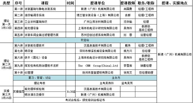 為了更好的提升油漆涂裝線技術(shù)人員和管理人員的專業(yè)技術(shù)水平,系統(tǒng)地學(xué)習(xí)了解油漆涂裝線的基本理論知識(shí)和專業(yè)新技術(shù),聯(lián)德攜手中國(guó)表面工程協(xié)會(huì)涂裝分會(huì)、上海涂裝行業(yè)協(xié)會(huì)及專業(yè)機(jī)構(gòu)于2017年3月13日-15日舉辦一次專業(yè)性強(qiáng)、知識(shí)覆蓋面廣泛的涂裝工程技術(shù)培訓(xùn)班,為廣大涂裝屆人士提供一場(chǎng)知識(shí)交流、技術(shù)提升的盛會(huì)。?主辦單位:中國(guó)表面工程協(xié)會(huì)涂裝分會(huì) 上海涂裝行業(yè)協(xié)會(huì) 聯(lián)德(廣州)機(jī)械有限公司協(xié)辦單位: 東莞豐裕電機(jī)有限公司 廣東智展展覽有限公司培訓(xùn)日期:2017年3月13日~3月15日【3天】08:30-17:00培訓(xùn)地點(diǎn):聯(lián)德(廣州)機(jī)械有限公司(廣州市大觀路科學(xué)城南云一路17號(hào))報(bào)名聯(lián)系人:中國(guó)表面工程協(xié)會(huì)涂裝分會(huì)/上海涂裝行業(yè)協(xié)會(huì)秘書處 :021-63529000 吳芳 :13761054243 吳偉玲 :13918293257課程表: