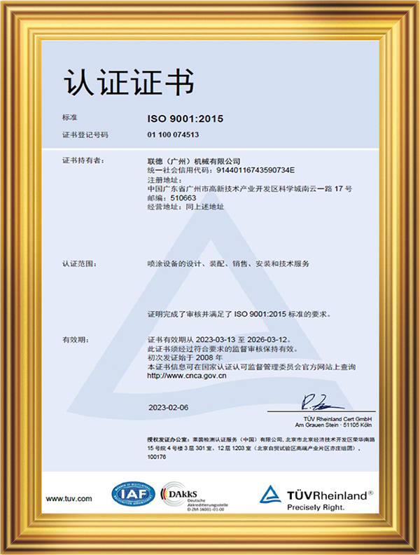 在產(chǎn)品質(zhì)量方面,聯(lián)德自1981年進(jìn)入靜電涂裝領(lǐng)域以來,始終秉承“客戶至上,匠心品質(zhì)”的品質(zhì)理念,現(xiàn)已形成了經(jīng)驗(yàn)豐富的質(zhì)量管理團(tuán)隊(duì),建立了覆蓋生產(chǎn)全流程的ISO9001質(zhì)量檢測體系,有效提升涂裝設(shè)備的穩(wěn)定性、良品率和完成效率,產(chǎn)品質(zhì)量控制水平受到客戶好評。