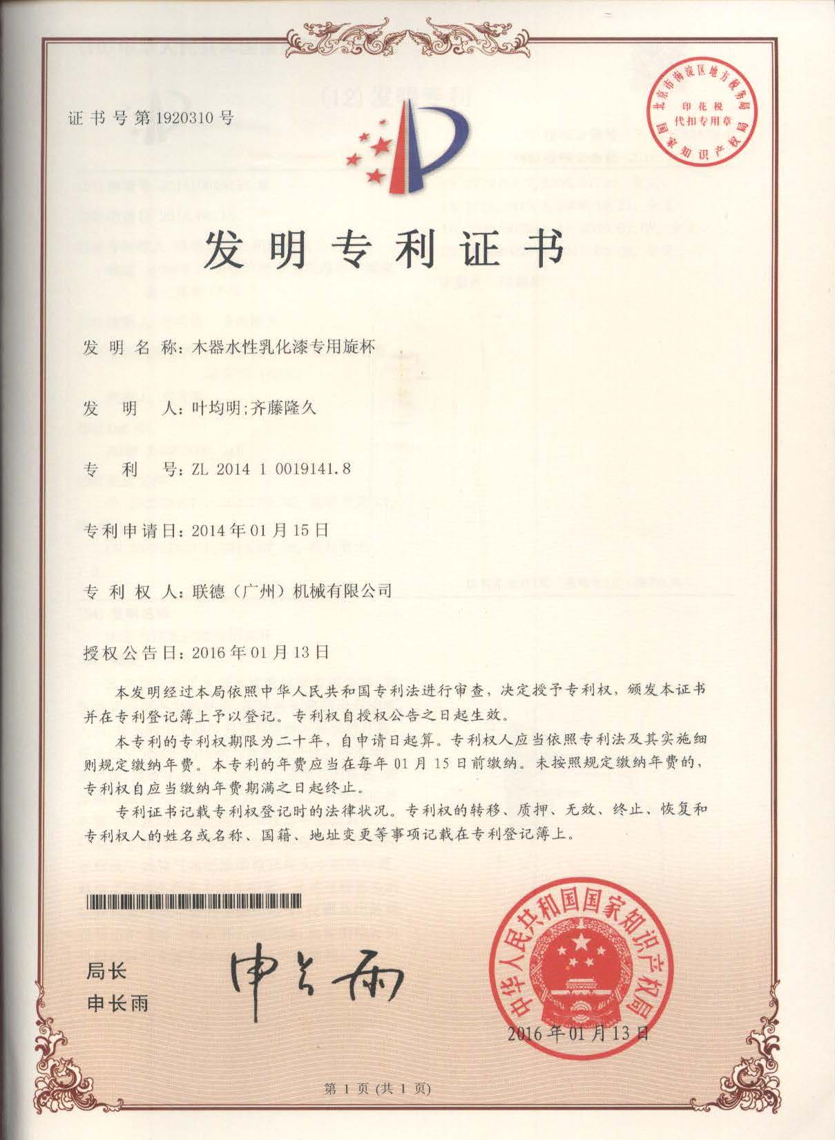 2016年1月13日,公司又一項(xiàng)發(fā)明專利獲得國(guó)家知識(shí)產(chǎn)權(quán)局授權(quán),此項(xiàng)專利名稱為《木器水性乳化漆專用旋杯》,專利號(hào)為ZL201410019141.8。