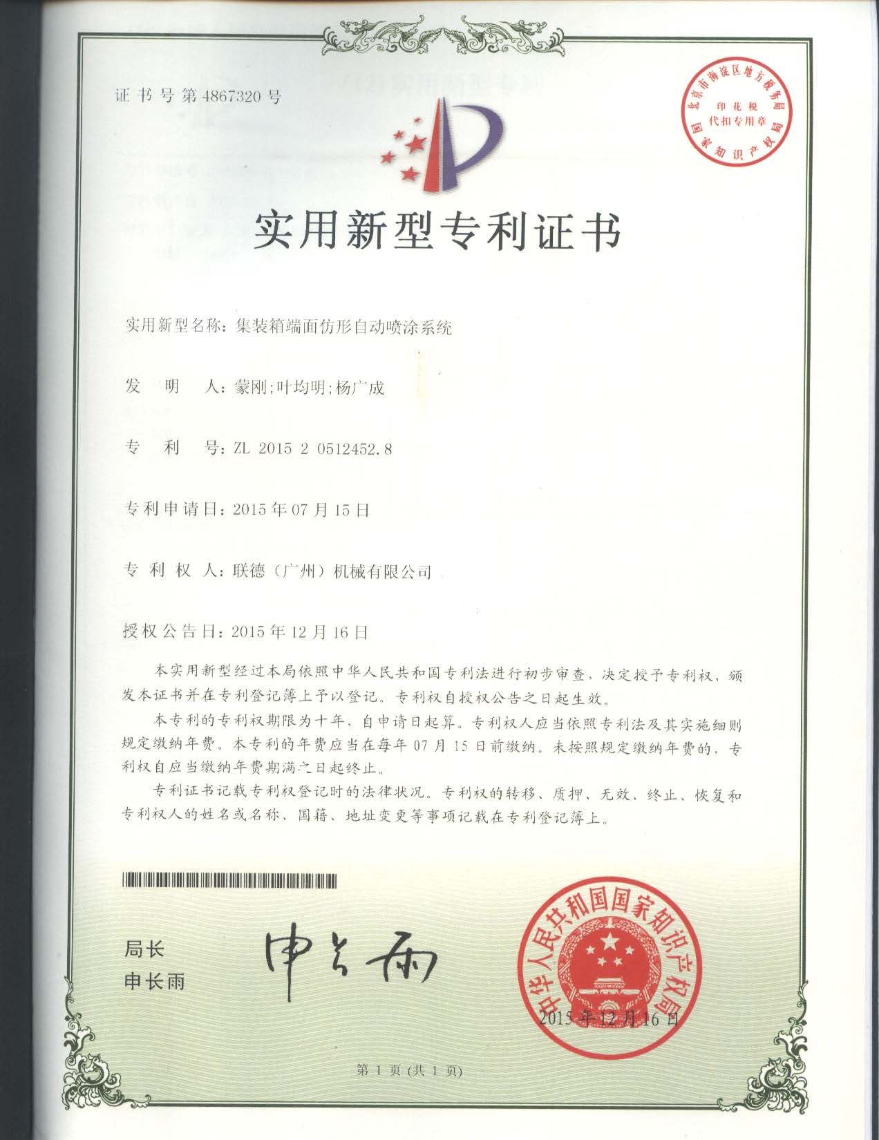 以下2015年獲得的專利證書(shū)