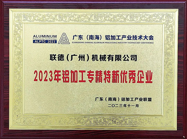 2023年11月11日,由廣東(南海)鋁加工產業(yè)聯盟和佛山市南海區(qū)鋁型材行業(yè)協會主辦的廣東(南海)鋁加工產業(yè)大會在佛山隆重召開。聯德(廣州)機械在大會上被授予“2023年鋁加工專精特新優(yōu)秀企業(yè)”稱號,受邀出席大會并接受表彰。