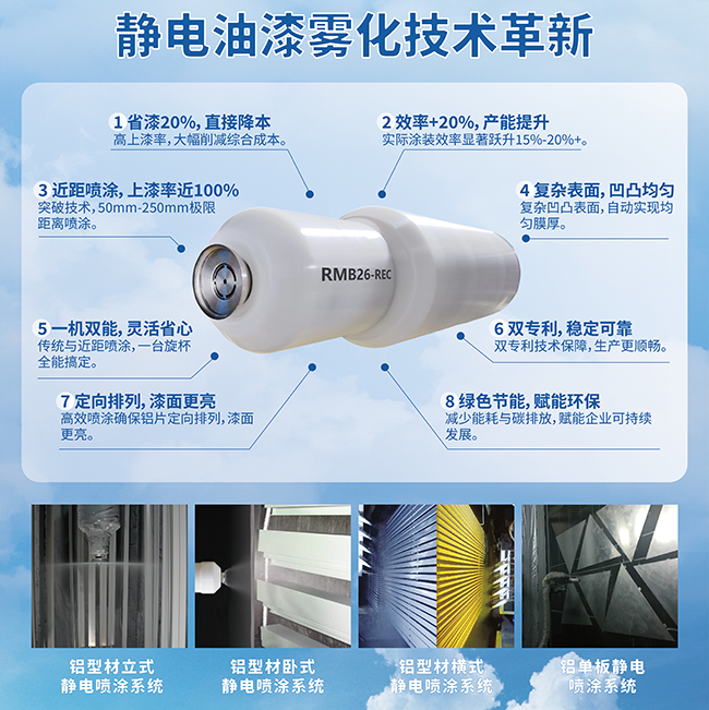 本次展會(huì)的焦點(diǎn)產(chǎn)品——蘭氏RMB26-REC近接旋杯,由Ransburg技術(shù)團(tuán)隊(duì)專為鋁型材高精度、高效率噴涂需求打造。該產(chǎn)品采用新一代靜電油漆霧化技術(shù),通過(guò)縮短旋杯與工件間距、優(yōu)化電場(chǎng)分布,實(shí)現(xiàn)三大核心優(yōu)勢(shì):